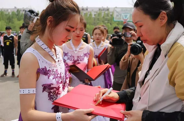 听闻苗立杰的到来,同学们热情高涨,纷纷涌向篮球场。苗立杰一踏进篮球场,就收到了大家热烈的掌声和欢呼声,感受到了家乡学子的热情,感受到了青年学生对她的喜爱。苗立杰对校篮球队员进行了耐心的指导,告诉队员们要保持一个良好的心态,她与队员们亲切合影留念,并为队员们签名。接过苗立杰亲笔签名的篮球,队员们都很激动,纷纷表示会以青年人昂扬的姿态去拼搏、去奋斗、去挑战每一场比赛,创造属于自己的未来。随后,学校理事长李宝山为苗立杰颁发聘书,聘请苗立杰为校篮球队荣誉教练。