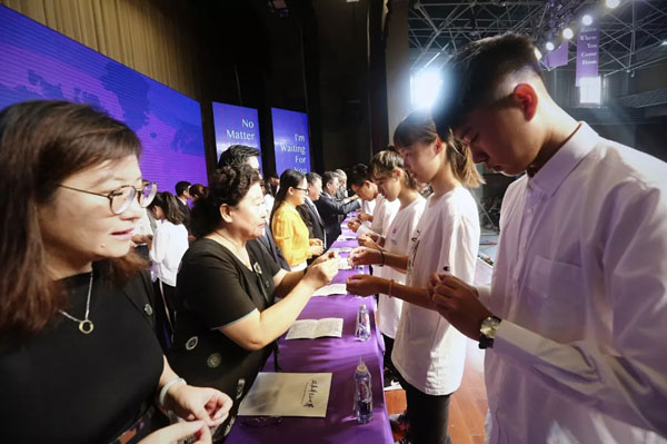 典礼上,新生代表依次上台接受嘉华学院老师授予的校徽,并将校徽佩戴在胸前。“博观约取,厚积薄发;立德立行,达己达人。”一声声校训和嘉华精神铿锵有力,掷地有声!相信2018级新生将把它铭记在心中,用行动践行校训。