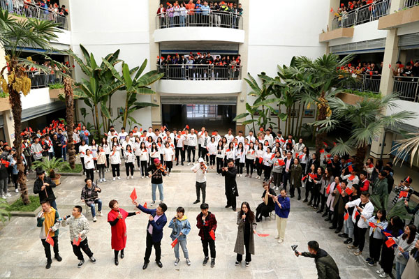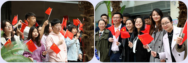 快闪活动持续推向高潮,更多的同学被吸引进来,舞蹈与唱歌的同学不时变换位置,形成新的队形,摆出新的姿势,整个活动愈发精彩。在一旁围观的同学们也扬起了小红旗,随着歌声与舞姿一起挥动。