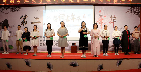 为弘扬中华民族优秀传统文化,提高我校学生的人文素质和道德情操,推动校园文化建设。4月22日晚上,由我校人文学院主办的第二届诗词嘉年华决赛在图书馆六楼报告厅举行。人文学院院长霍维洮,副院长马廷福,校团委书记乔丽娜及各学院辅导员参加本次活动。