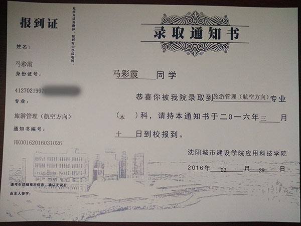 恭喜马彩霞同学被我校录取【沈城建航空】
