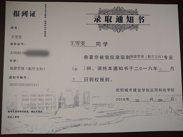 恭喜王雪雯同学被我校录取【沈城建航空】