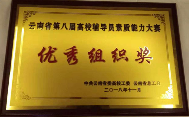 2018年11月29至30日,由省委高校工委、省总工会主办,云南财经大学承办的云南省第八届高校辅导员素质能力大赛决赛在云南财经大学举行,来自全省64所高校的78名高校辅导员聚集一堂,交流思想,畅谈心得,进行了辅导员工作技能的大比拼。我校湿地学院辅导员吴楠代表学校参加比赛,并获得大赛二等奖。我校获得优秀组织奖。