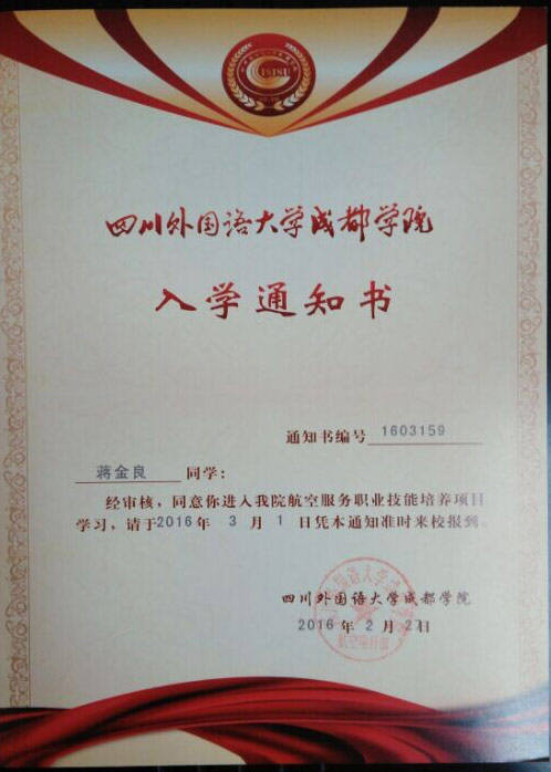 恭喜蒋金良同学被我校录取【川外成都航空】