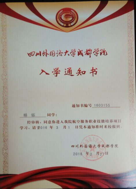 恭喜杨铄同学被我校录取【川外成都航空】