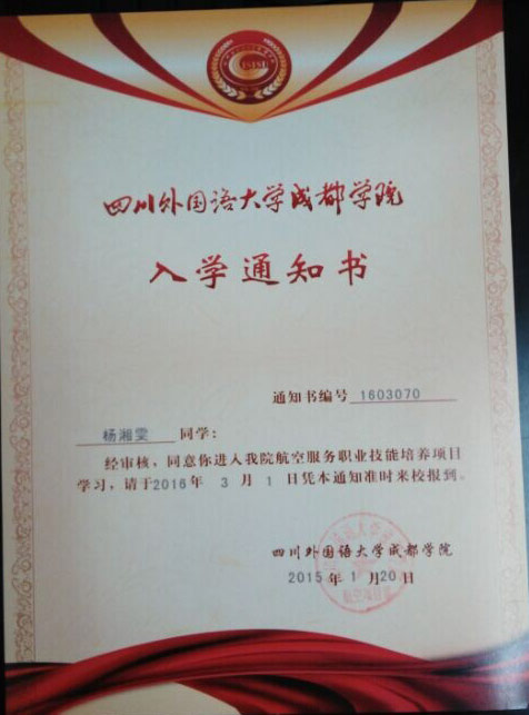 恭喜杨湘雯同学被我校录取【川外成都航空】