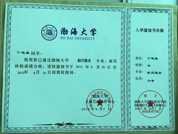 恭喜丁旭晶同学被我校录取【渤海大学航空】