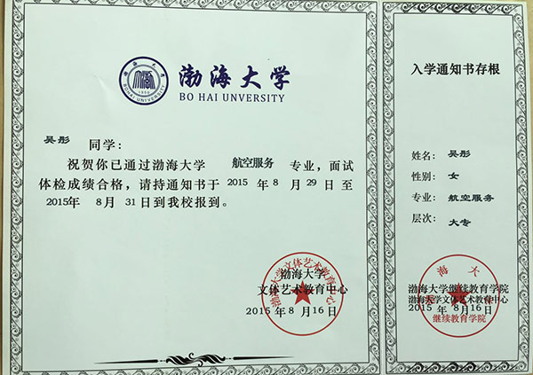 恭喜吴彤同学被我校录取【渤海大学航空】
