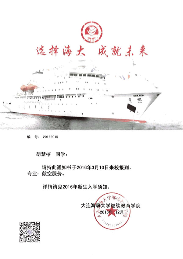恭喜胡慧榕同学被我校录取【大连海事大学航空】