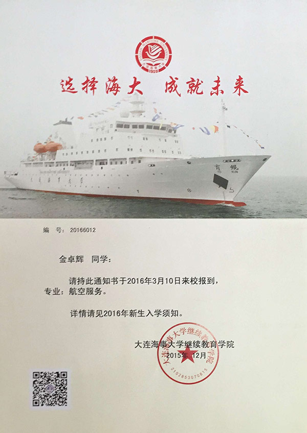 恭喜金卓辉同学被我校录取【大连海事大学航空】