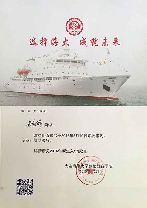 恭喜惠安琦同学被我校录取【大连海事大学航空】