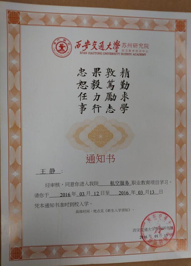 恭喜王静同学被我校录取【西交大苏州航空】