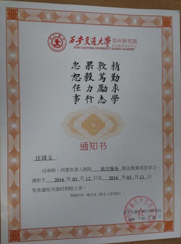 恭喜汪琦玉同学被我校录取【西交大苏州航空】