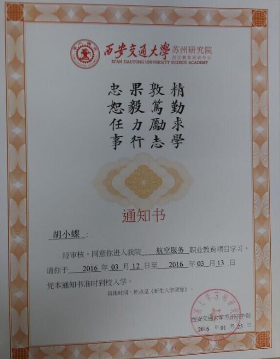 恭喜胡小蝶同学被我校录取【西交大苏州航空】