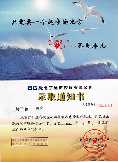 恭喜敖子萱同学被我校录取【东海学院航空】