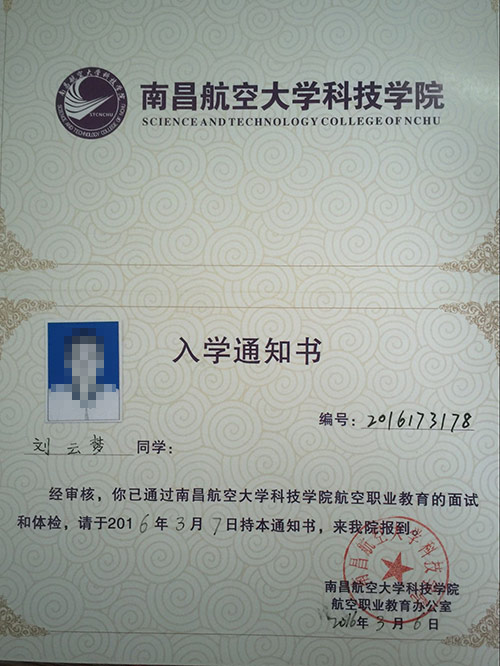 恭喜刘云梦同学被我校录取【南航航空】