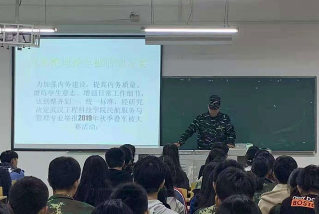 为加强内务建设,提高内务质量、磨练学生意志、增强日常工作细节,达到整齐划一、统一标准,经研究决定武汉工程科技学院民航服务与管理专业举报2019年秋季叠军被大赛活动